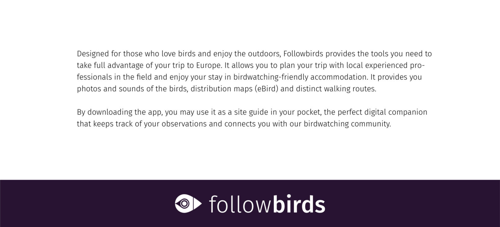 Followbirds allows you to plan your trip with local experienced professionals in the field and enjoy your stay in birdwatching-friendly accommodation. It provides you photos and sounds of the birds, distribution maps (eBird) and distinct walking routes with a 360° view of specific suggested areas.